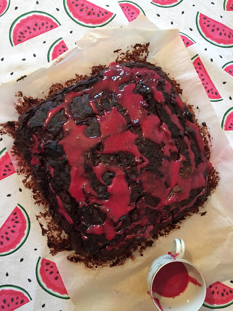 Czy będzie to dziwne, jeśli napiszę, że nigdy nie robiłam wcześniej brownie?:) Czasem lepiej nie zaczynać, bo ciasto jest niebezpiecznie kuszące, nie skończysz go jeść od tak sobie, dopóki nie poczujesz, że się zasyciłeś. Dodatek buraczków poniekąd usprawiedliwia objadanie się nim na przedwiośniu, można się pokusić o stwierdzenie, że ma charakter niemalże dietetyczny, he he. Jedyne co zmieniłam w przepisie to sposób przygotowania lukru – moje buraczki nie oddały soku, a zatem lukier przygotowałam z cukru pudru i soku malinowego. Przepis z BBC Good Food - zwrócił mi wiarę w ten magazyn, bo dotychczas wyróbowane 2 przepisy, mimo piekielnie kuszących zdjęć, były totalnymi niewypałami. Smacznego!